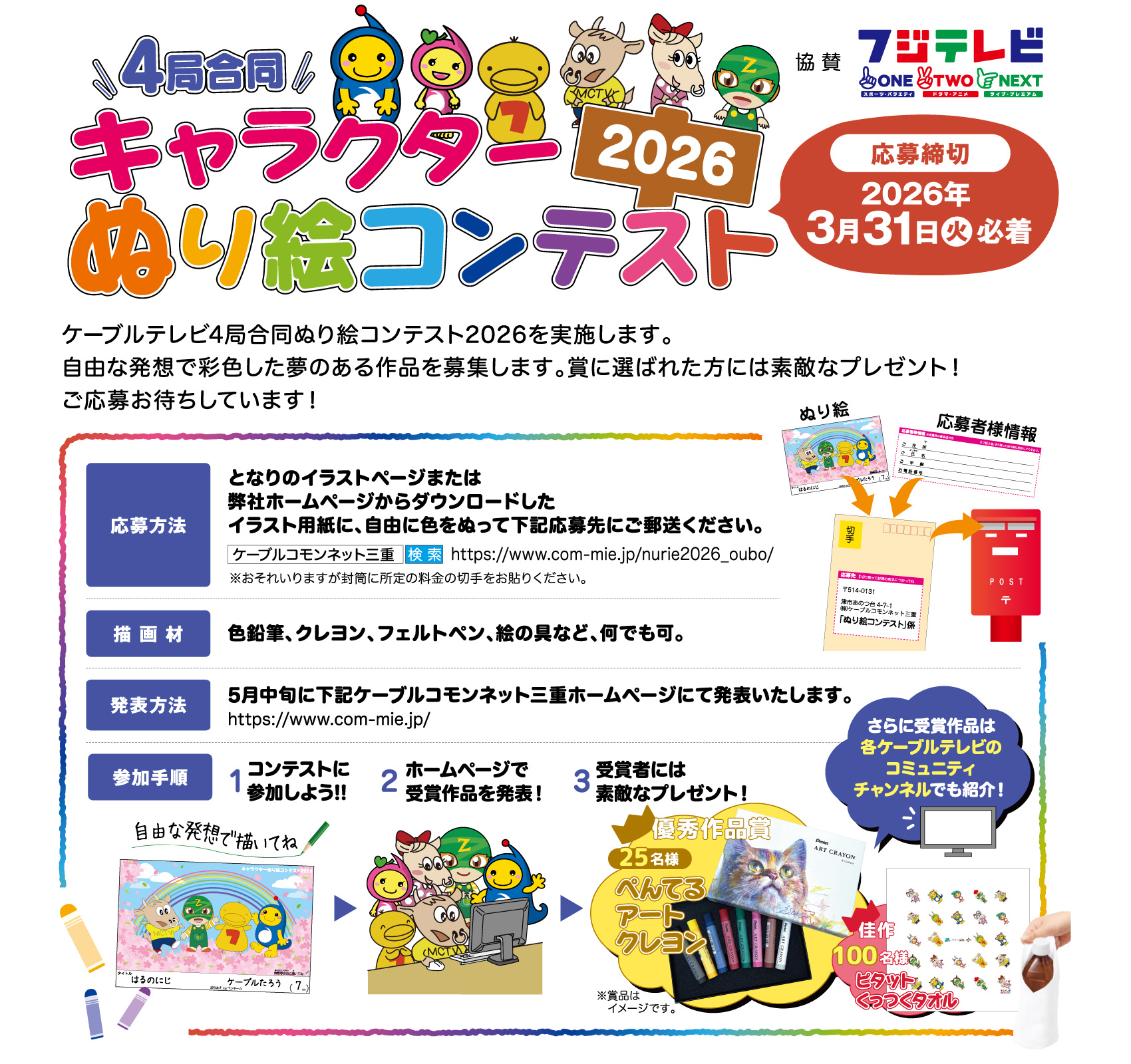 【イベント情報】 4局合同 キャラクターぬり絵コンテスト2026 開催!