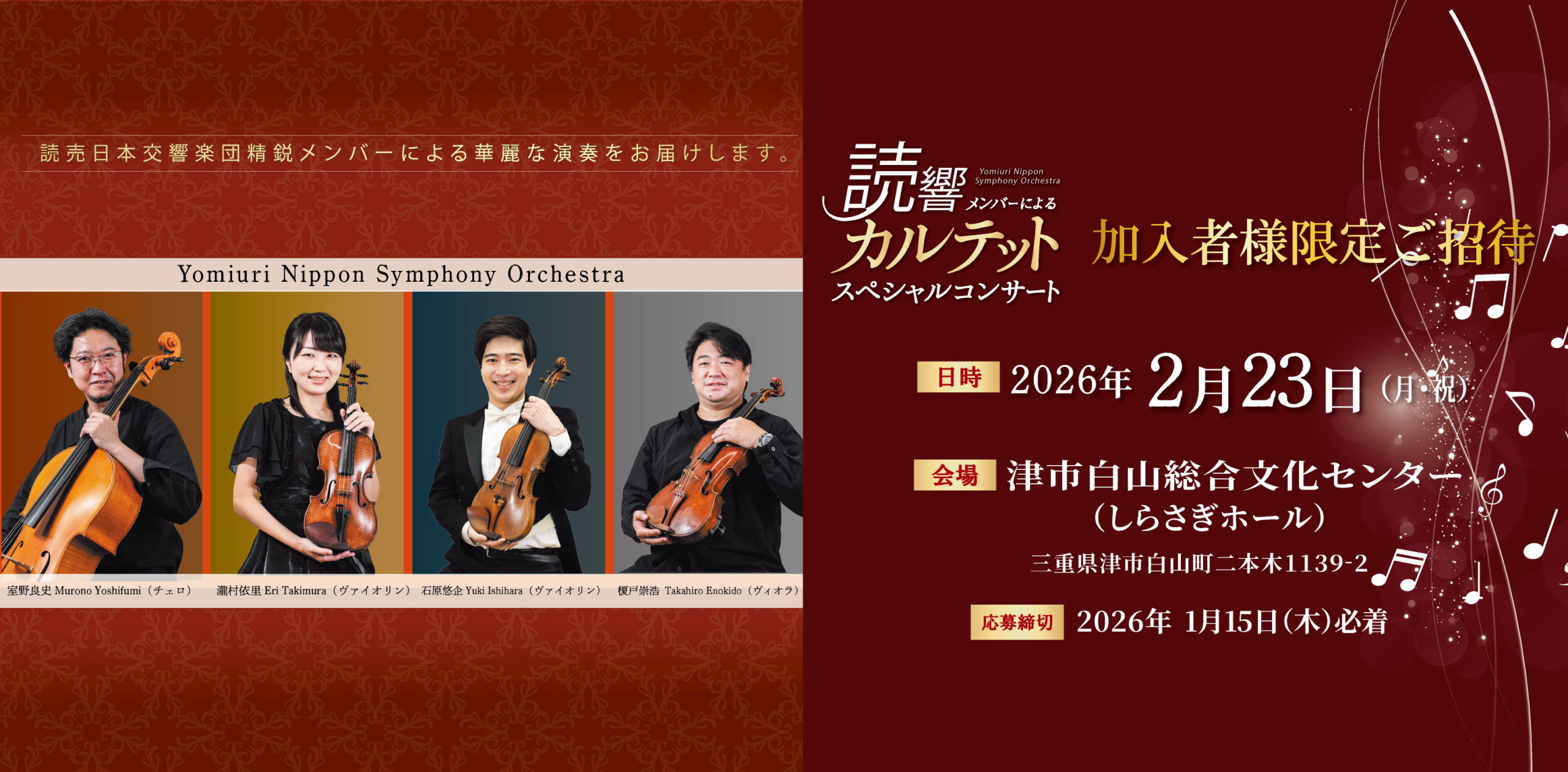 【イベント情報】 「読響メンバーによるカルテット スペシャルコンサート」にペア250組500名様をご招待!